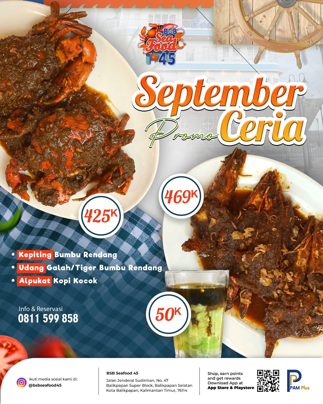 ✨ September Ceria di BSB Seafood 45 ✨Bikin momen makanmu makin spesial dengan Kepiting & Udang Galah Bumbu Rendang khas BSB Seafood 45! 🍴🔥 🥘 Kepiting Bumbu Rendang – 425K🍤 Udang Galah/Tiger Bumbu Rendang – 469K🥑 Alpukat Kopi Kocok – 50K Nikmati sajian istimewa ini hanya di BSB Seafood 45, Balikpapan 🌊🦀 📞 Info & […]